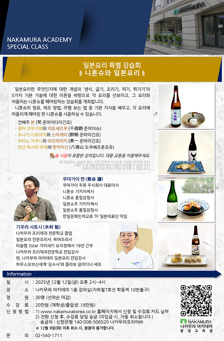 “니혼슈와 일본요리” 특별 강습회를 개최합니다.